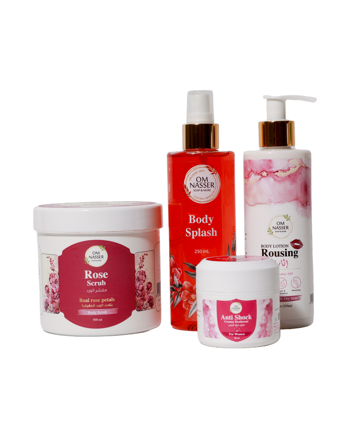 • مقشر الورد: غني بخلاصات بتلات الورد والزيوت الطبيعية، يعمل على تقشير الجسم بلطف، يمنح الجلد ملمسًا حريريًا ويفتح لونه مع كل استخدام، ويترك رائحة ناعمة تدوم لساعات.